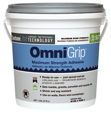 Omnigrip, Gallon Pail, Maximum Strength Adhesive, Unique Formula Offers Many Benefits Not Found In Traditional Adhesives Including 33% Less Shrinkage Ensuring The Highest Bond Strength, Applies Effortlessly, Doesn't Sag & Is Easier To Carry, Exceeds ANSI A136.1, Type I.