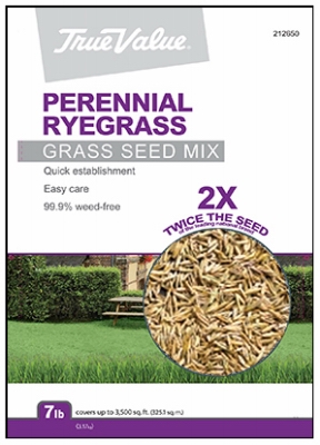 True Value, 7 LB, Perennial Ryegrass Seed, 100% Perennial Ryegrass, Coverage: New Lawns = 960 SQFT, Over Seeding = 1,920 SQFT, Bagged.
